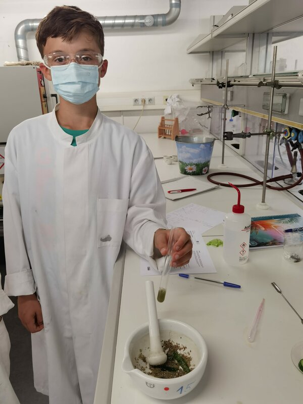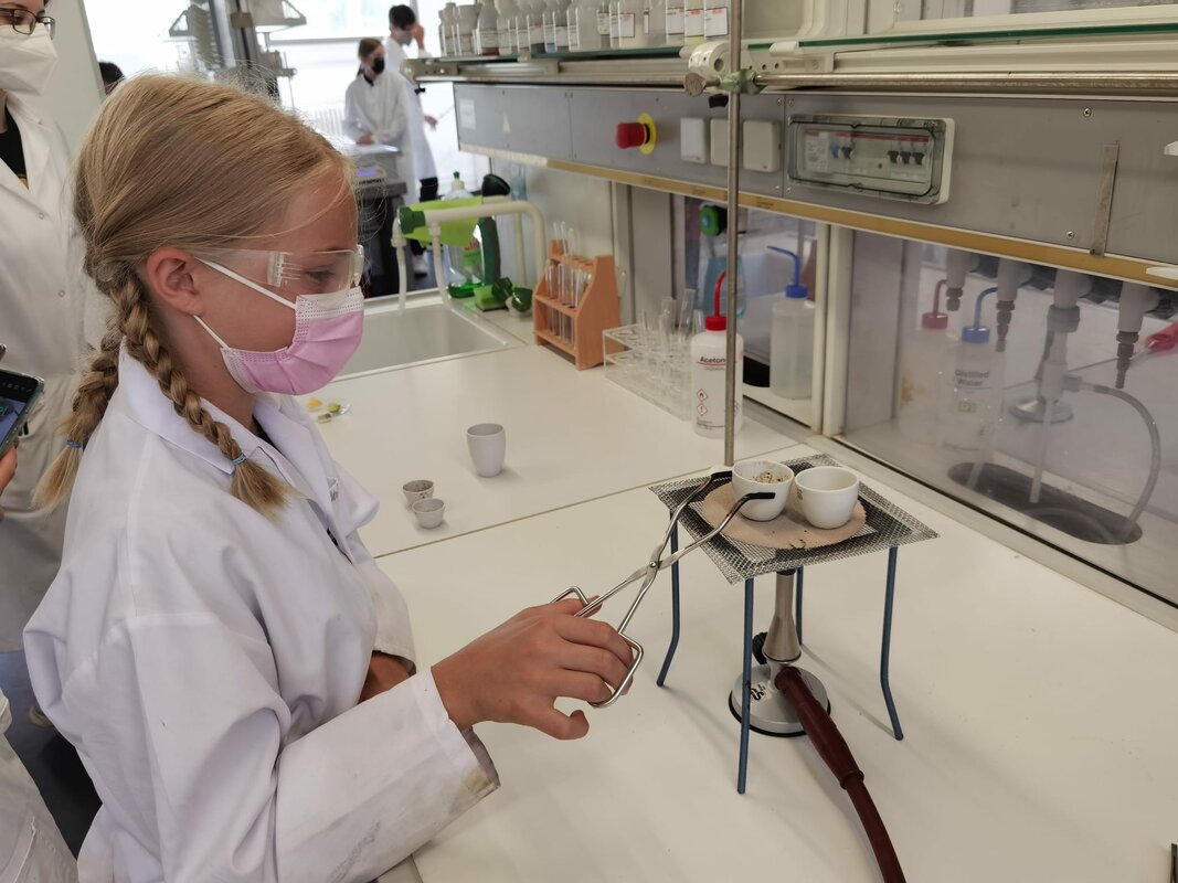 So konnten die Jungen und Mädchen ihre eigenen Versuche zusammenstellen und mit allerlei Geräten – z.B. Bunsenbrenner, Mörser, Filter, Reagenzgläser etc. die Stoffe, die es zu untersuchen galt, z.B. für den Stärkenachweis Kartoffeln, erforschen. Richtig professionell wurde das Ganze durch ein Protokoll, das die jungen Wissenschaftler*innen führten und in dem sie ihre Ergebnisse dokumentierten.