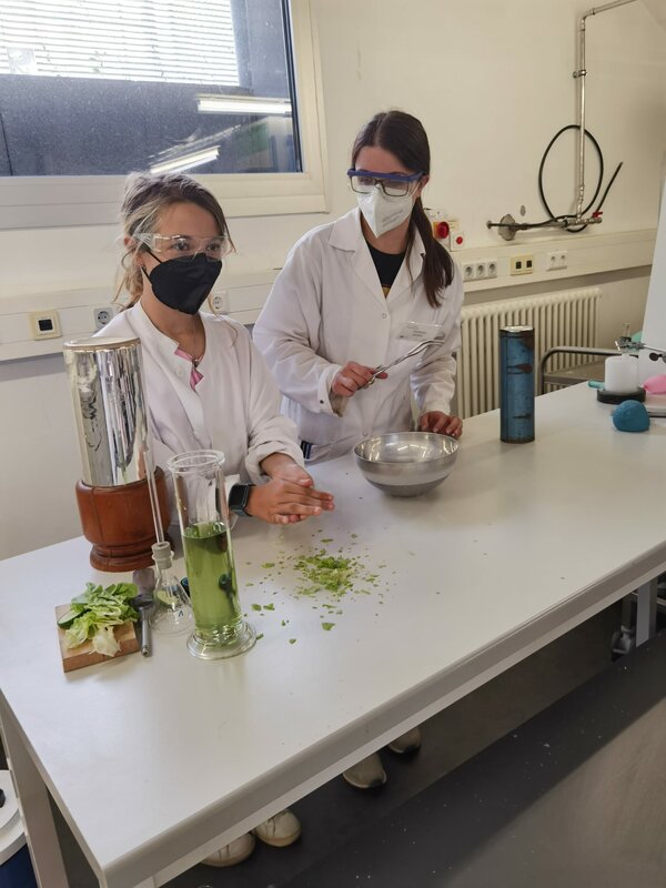 Im Gebäude B2.2 der Naturwissenschaftlich-Technischen Fakultät III ging es dann in das Schülerlabor, wo die Betreuer*innen des Projekts sie in Empfang nahmen und ihnen ihrem Alter und dem Schullehrplan entsprechende Aufgaben vorlegten, die sie durch eigenständiges Forschen und Experimentieren mit den bereitstehenden Geräten und Chemikalien lösen mussten - das alles natürlich gebührend im weißen Laborkittel und mit Schutzbrille.