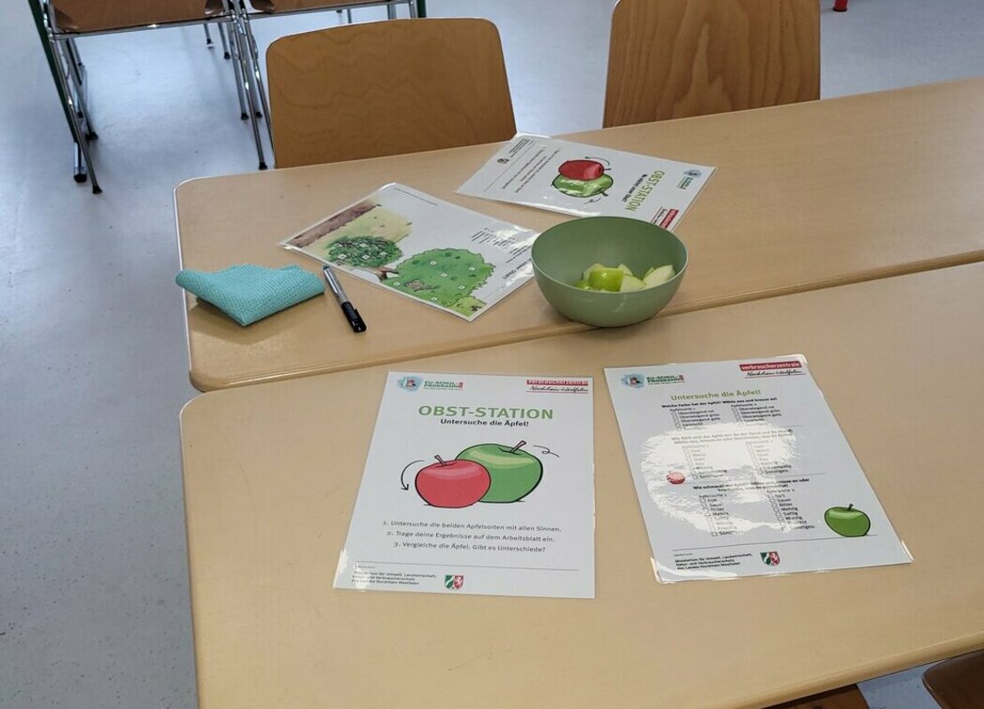Viel Spaß hatten die Kids im Geschmacks- und Sinnesparcours. Ob mit der Nase oder auf der Zunge, die Stationen boten die Gelegenheit, Obst und Gemüse mit allen Sinnen kennenzulernen. Diese Initiative der Verbraucherzentrale war das Begleitprogramm, das die Kinder erleben durften, weil sie am Schulobstprogramm teilnehmen.
